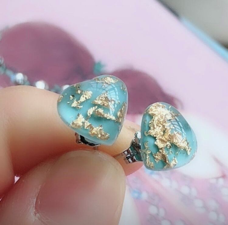 【再入荷】【即納】♡ハート型 ミントブルー クリア×ゴールドデザインピアス♡