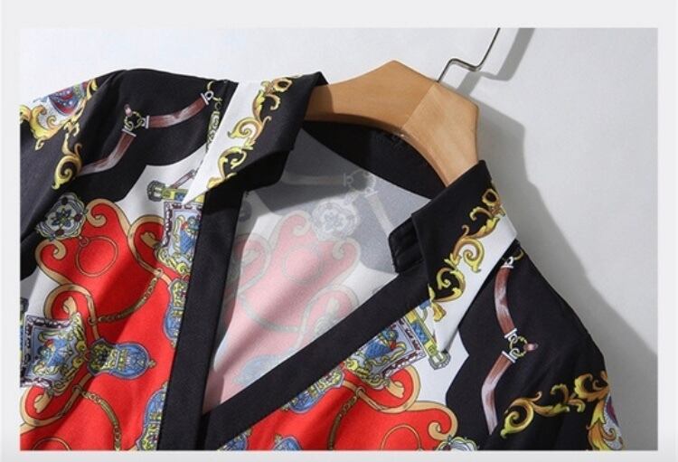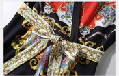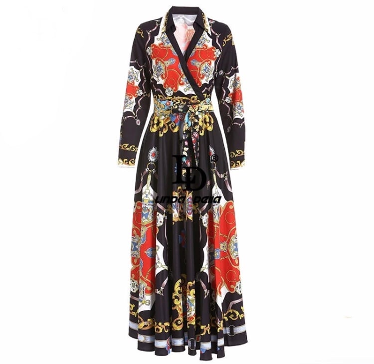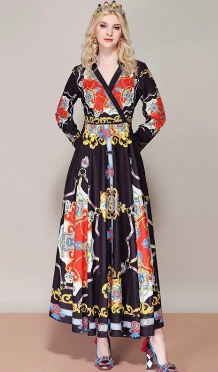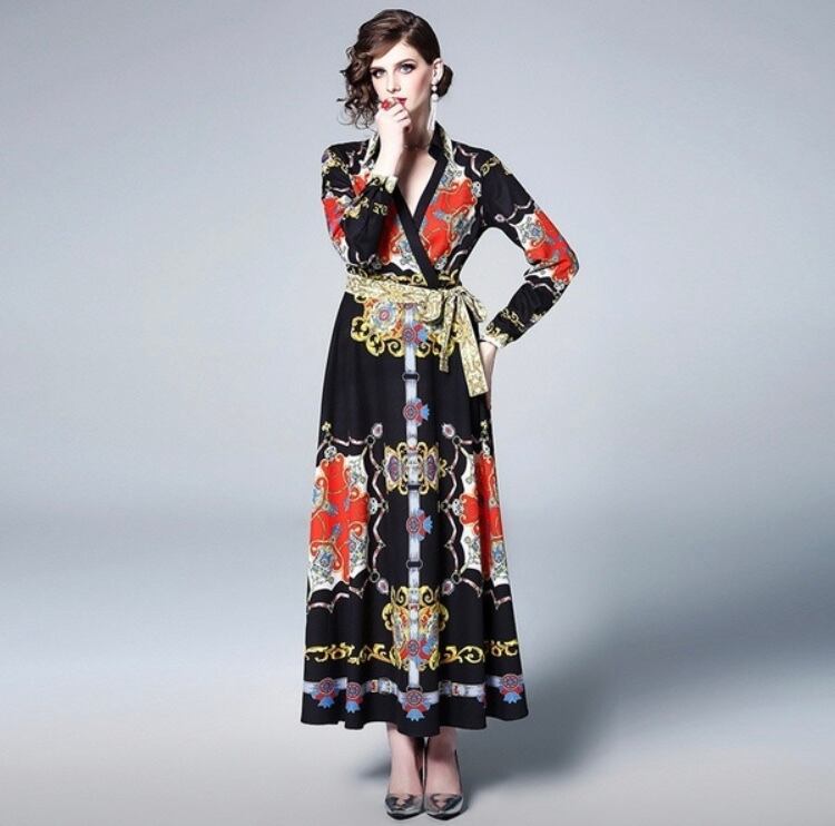 【即納】♡マキシマムドレス♡ヴィンテージデザイン ゴージャス スカーフ柄ワンピース ドレス♡Vネック ベルト リボン セレブ レトロ モダン 大人 ドレスゴージャス レッド ブラック リボン セクシー 長袖 ロング丈 マキシ丈