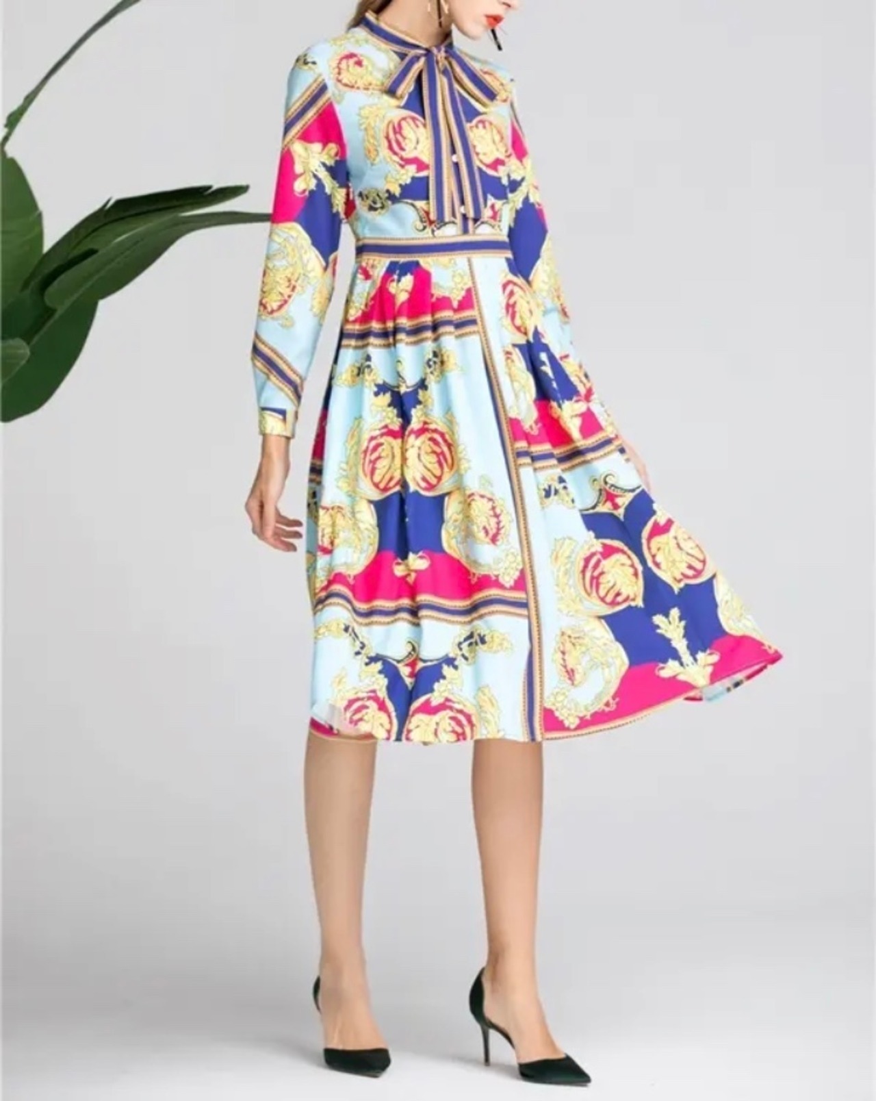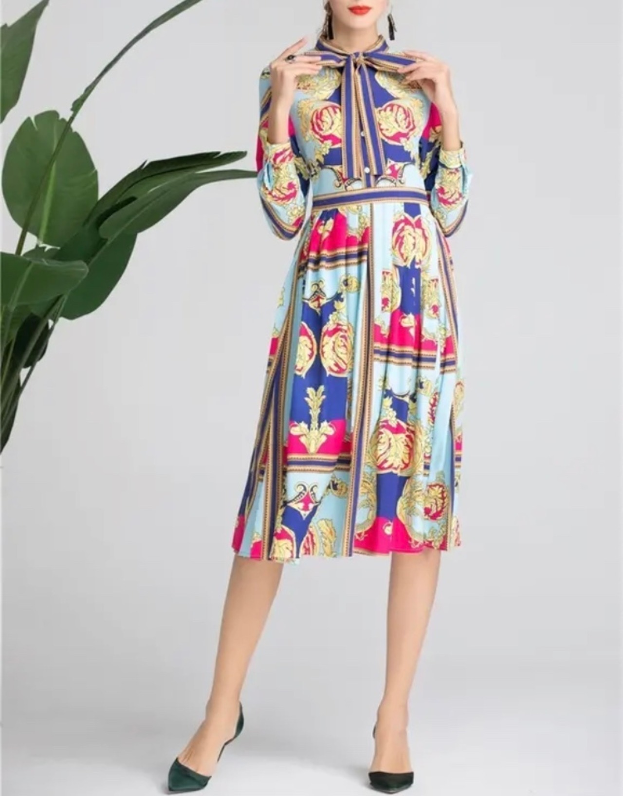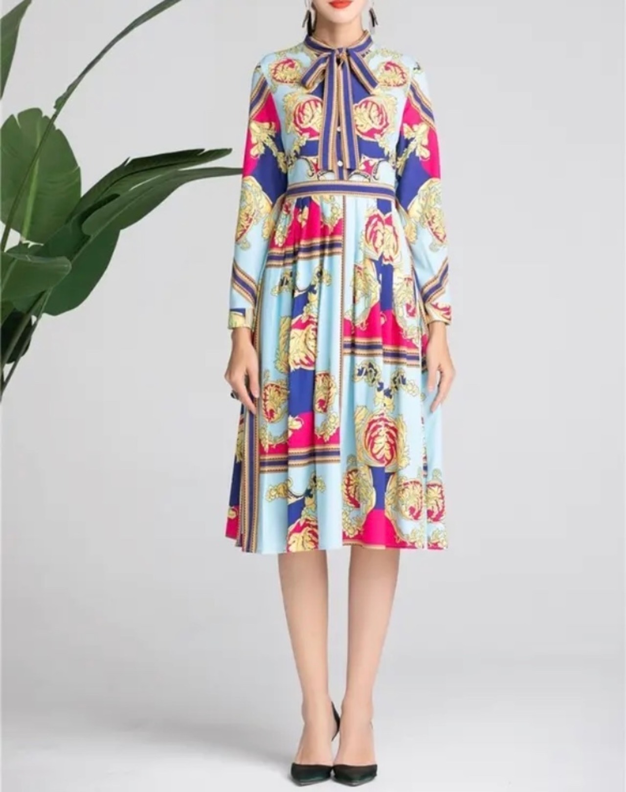 送料無料【即納】♡リボン プリーツフレアスカート 長袖 ゴージャスワンピース♡スカーフ柄 ブルー ピンク 水色 ミントブルー 襟