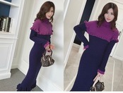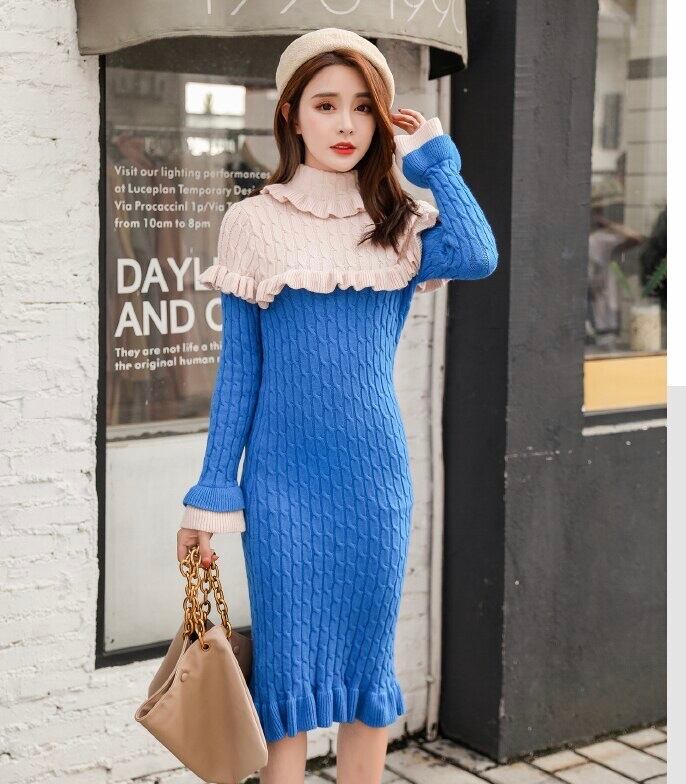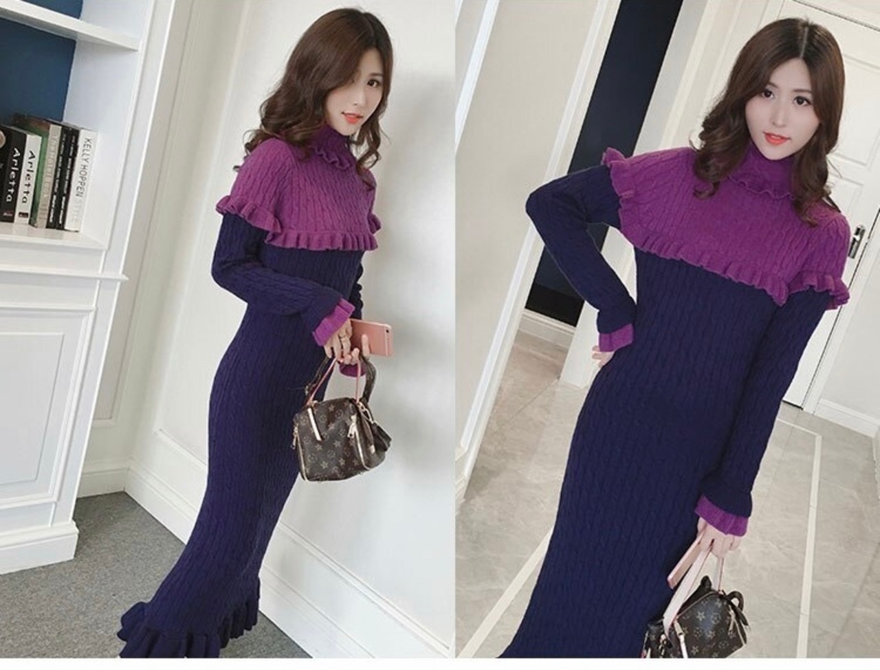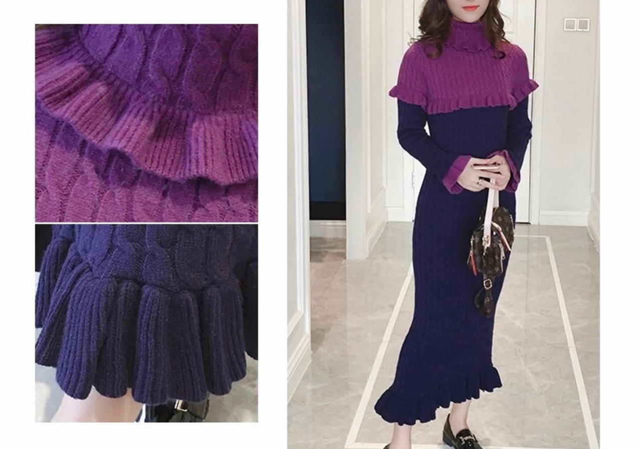 【即納】2カラー♡おしゃれカラーのミモレ丈フリル襟 タートルネックニットワンピース2カラー♡ホワイト ブルー パープル ネイビー デート 大人可愛い トレンド