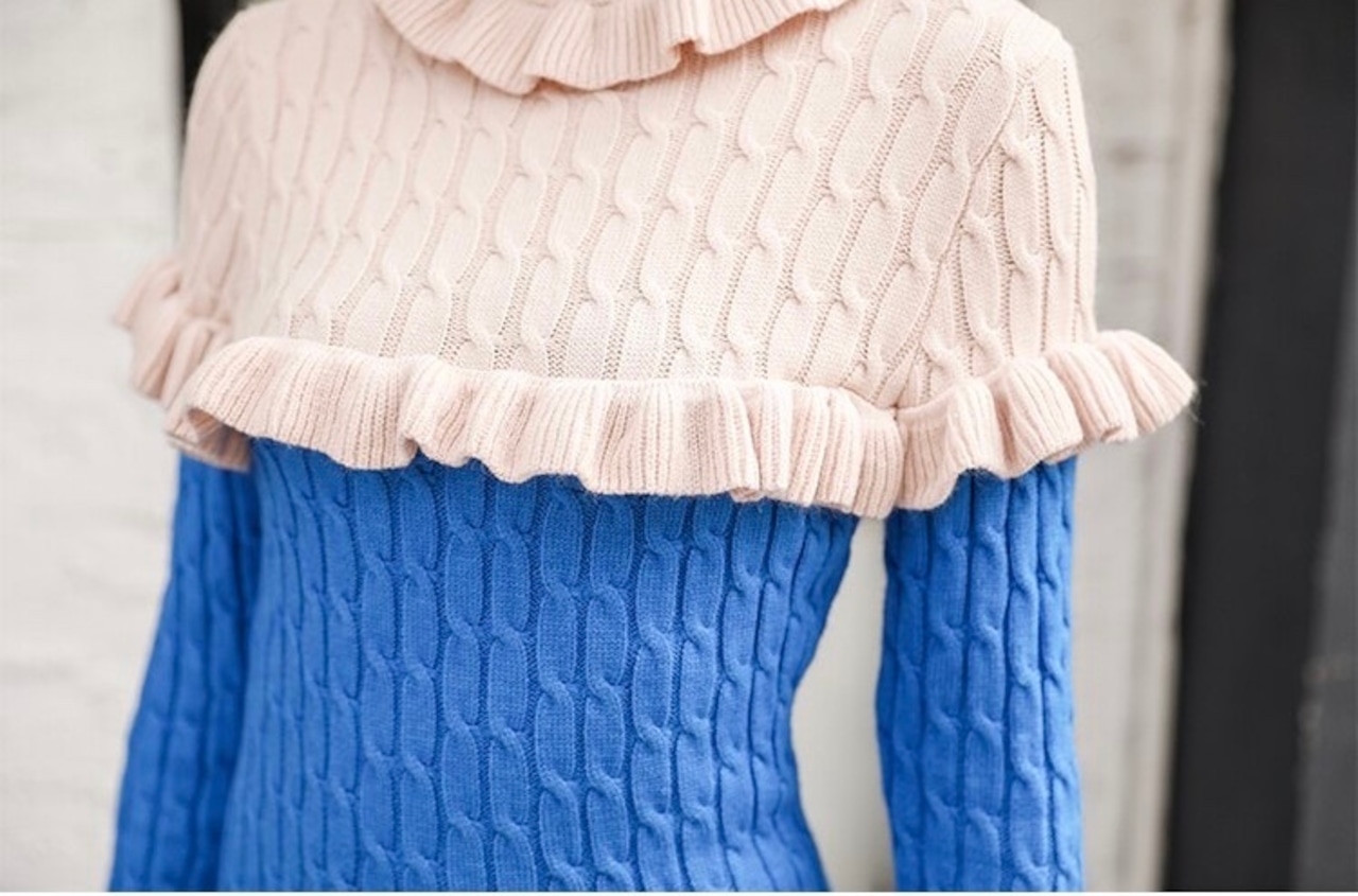 お色の組み合わせも、タートルネック部分、いろの切り替えの部分、袖口、ワンピースの裾全てに共布フリルデザインがとても可愛いです^_^