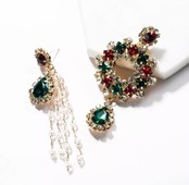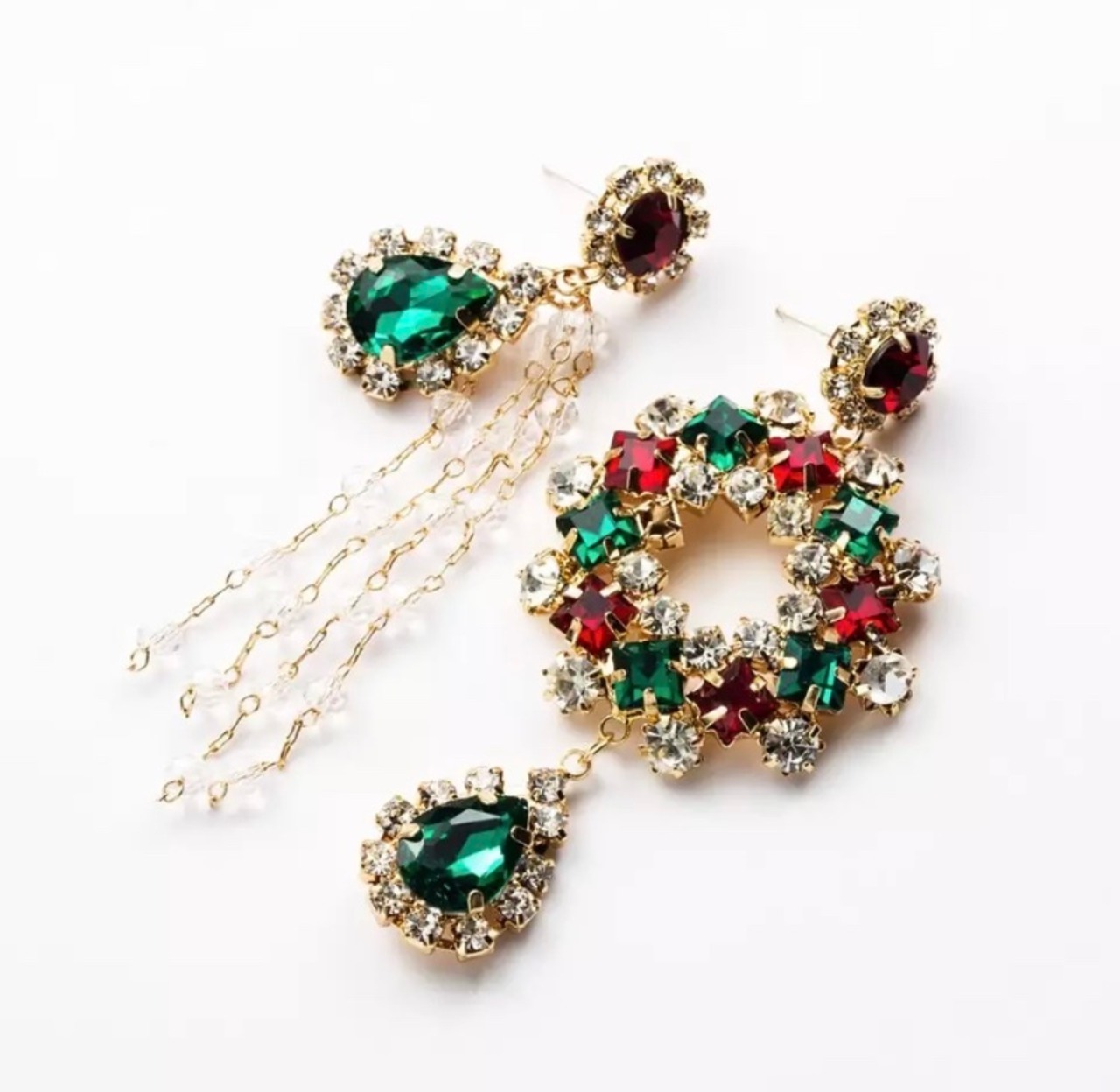 左右デザインの違うゴールド×グリーン、レッドのしゃらしゃら揺れが可愛いピアスになります♡