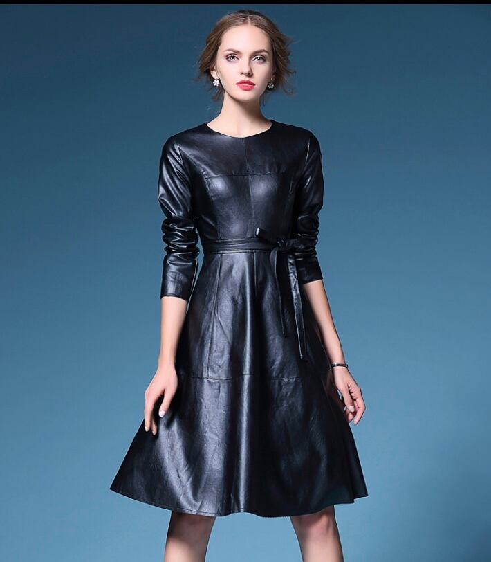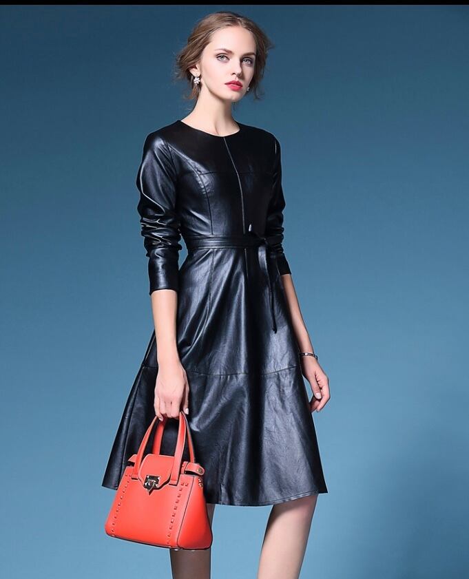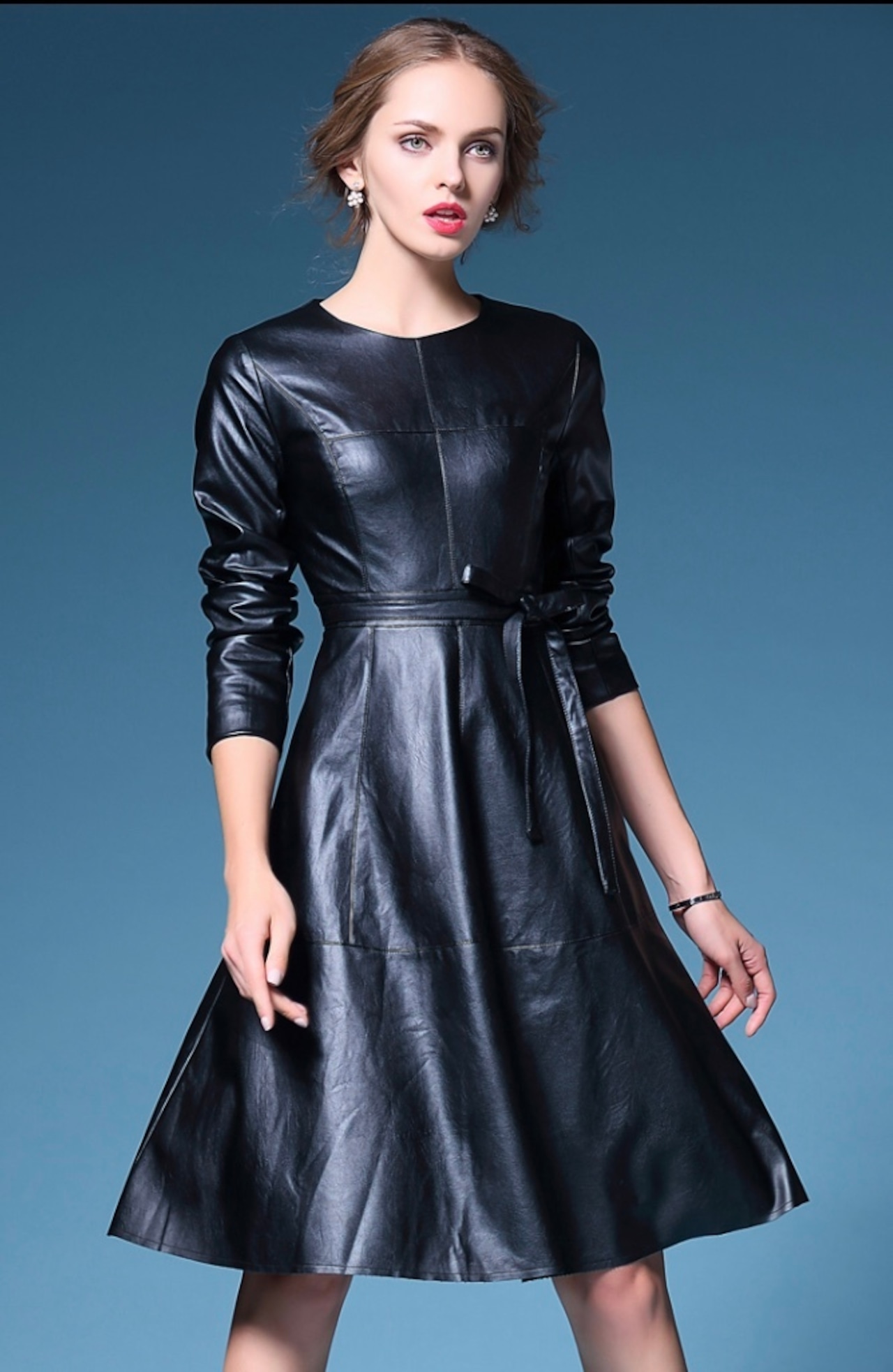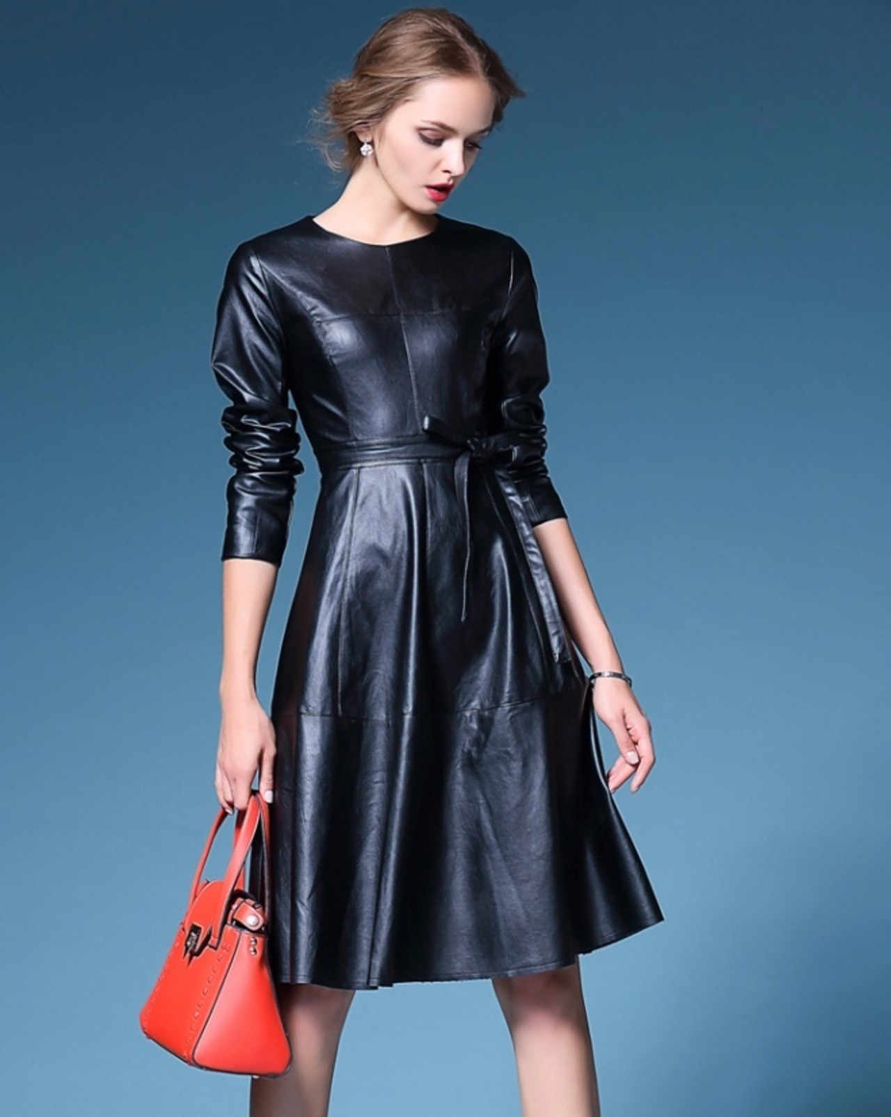 【即納】 ♡上品なレディさんレザーフレアワンピース ベルトおリボン付き♡ブラック 黒 高級 セレブ おしゃれ
