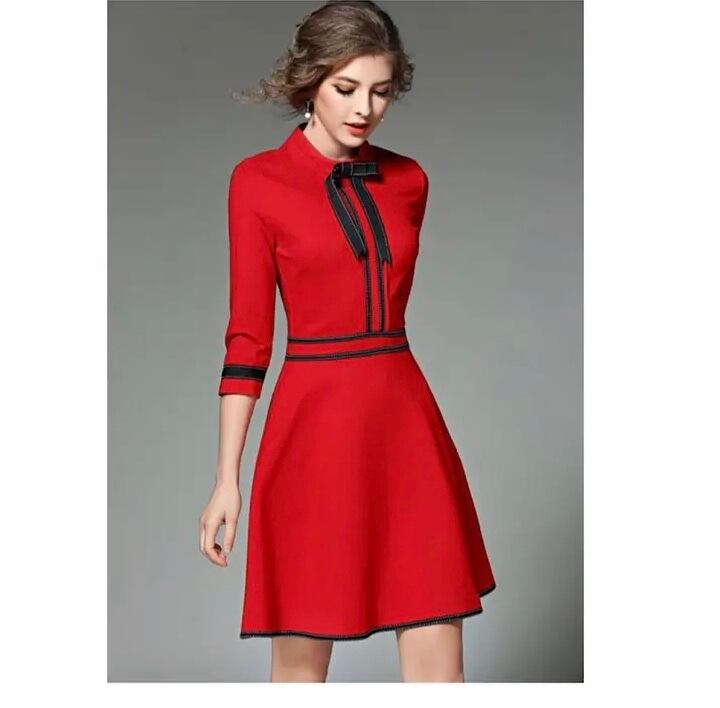 送料無料【即納】 ♡おリボンレトロなステッチ入り Aラインワンピース♡長袖 赤 レッド 人気 セレブ ヴィンテージ 可愛い シェリーライン