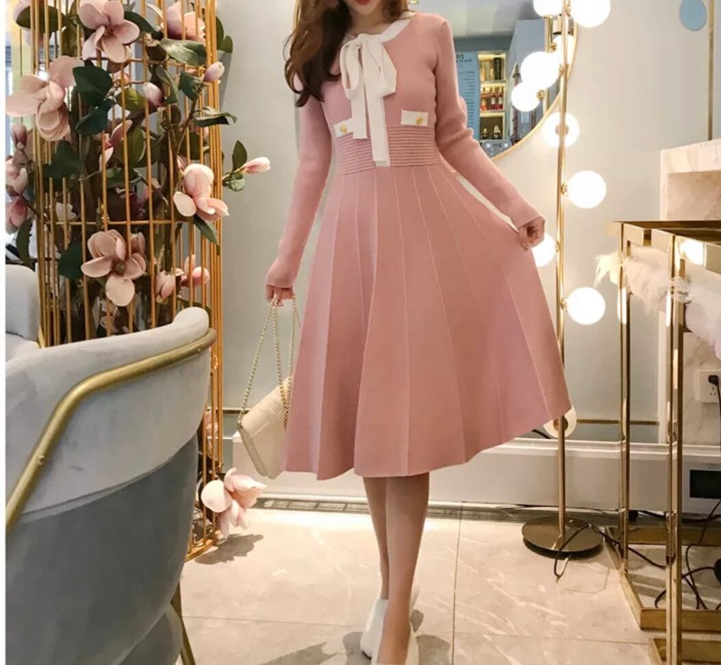 ベビーピンクのお嬢様スタイルの上品なニットワンピースになります♡