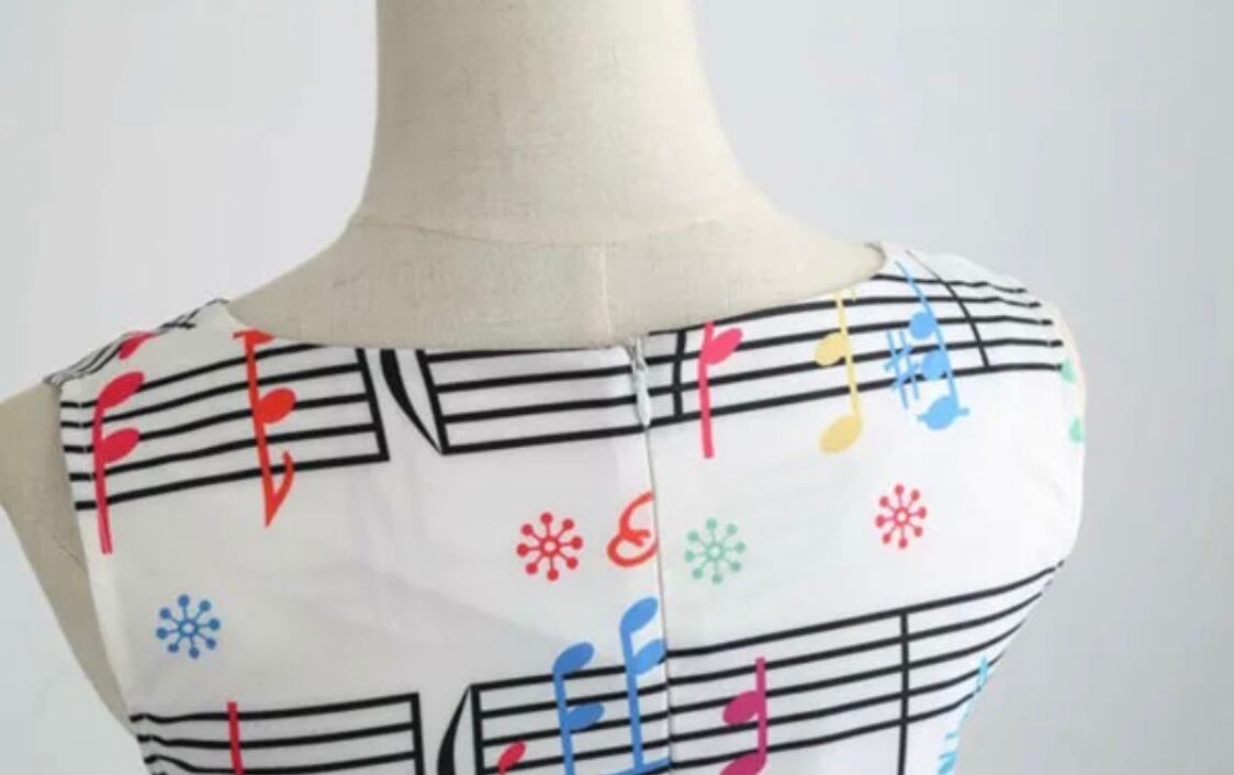 ノースリーブのカラフルな音符柄のフレアワンピースになります♡