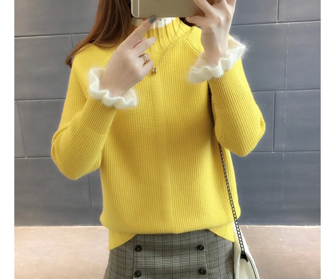 お袖口のふわふわの白いフリルがとても可愛いイエローのタートルネックのニットになります♡