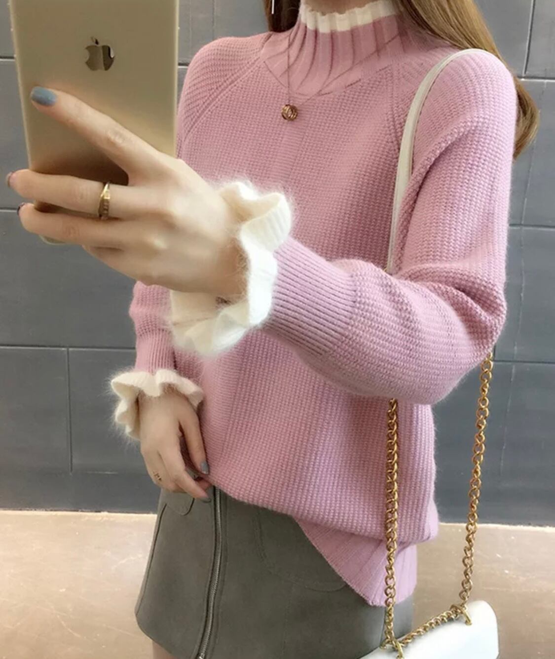 お袖口のふわふわの白いフリルがとても可愛いピンク×ホワイトのタートルネックのニットになります♡