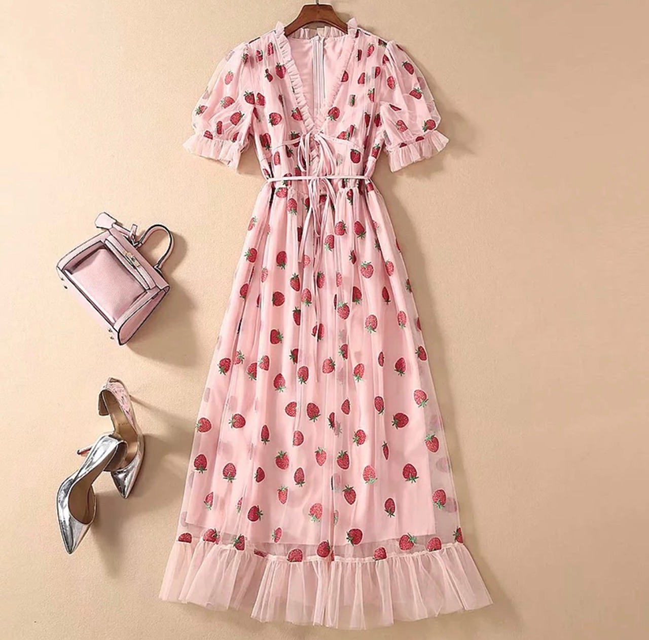 再々入荷❣️♡苺のスパンコール胸下切り替え大人乙女ワンピース♡海外セレブ多数着用