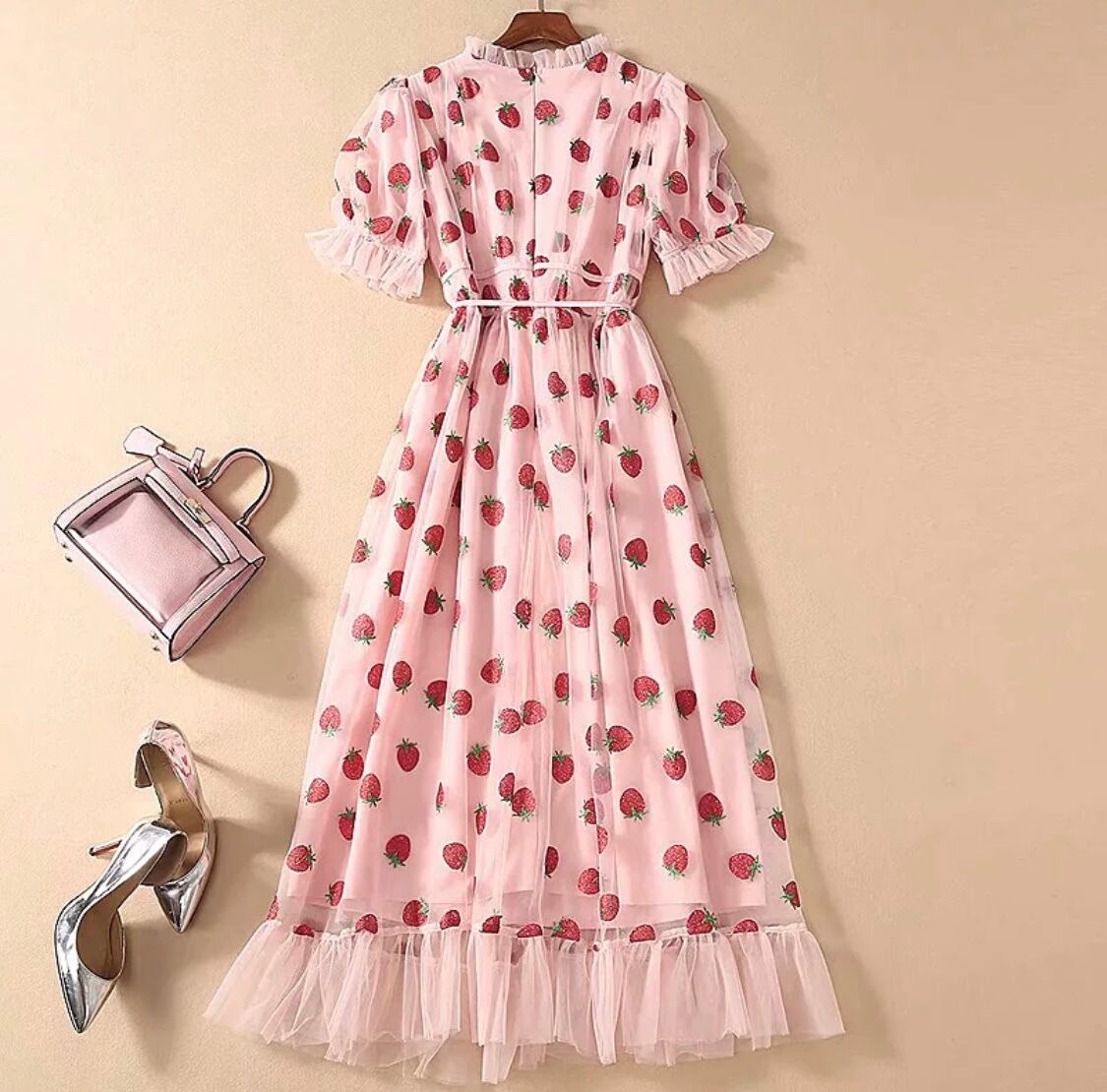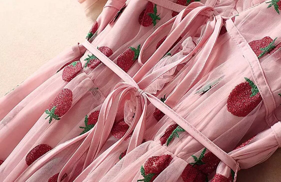 オーガンジーレース、フリル、スパンコールで刺繍された苺柄などとても素敵なワンピースになります♡