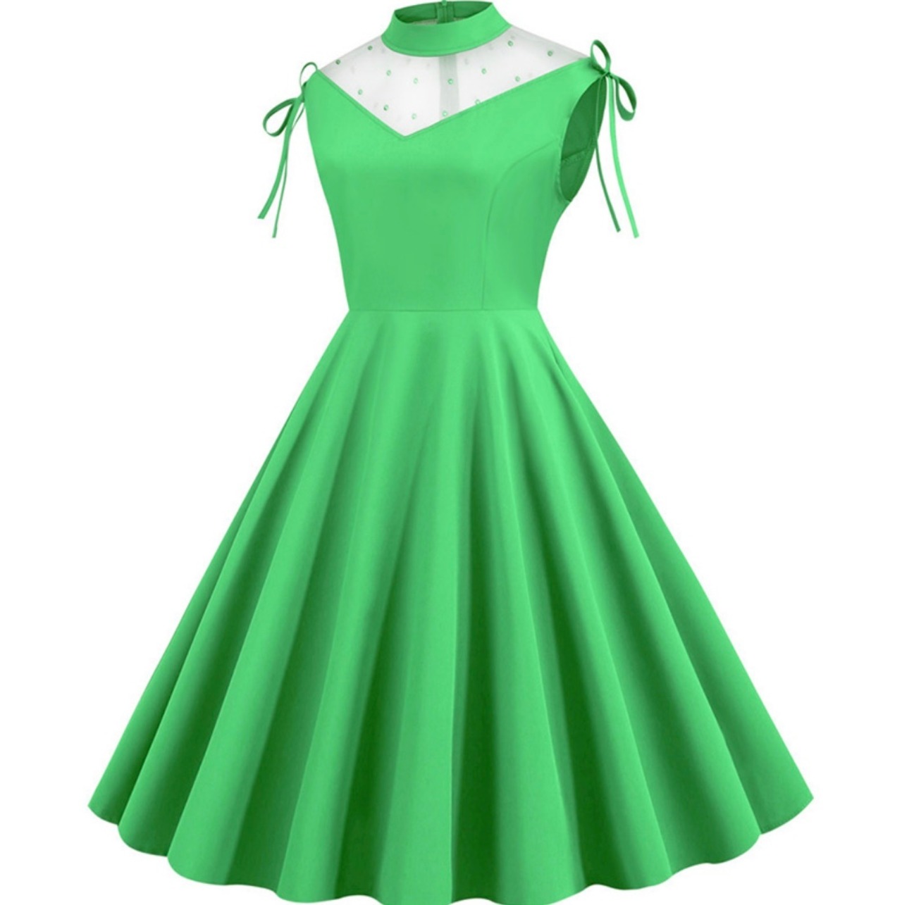【即納】 ♡肩におリボン♡レトロラブリーガール♡グリーンフレアワンピース♡