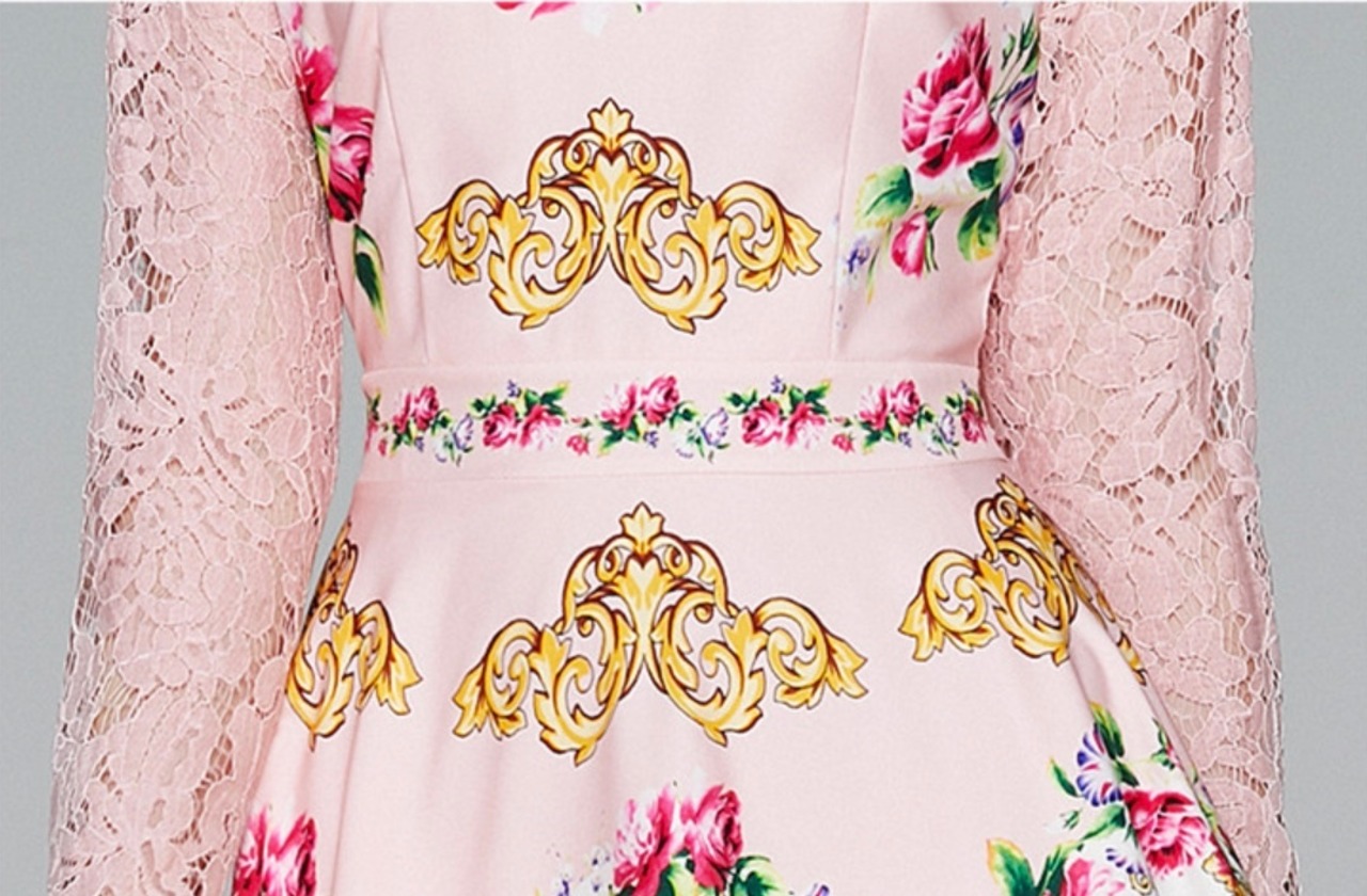 ラブリーでスイートなロココ調の柄ののベビーピンクのワンピースになります(*˘︶˘*).。.:*♡