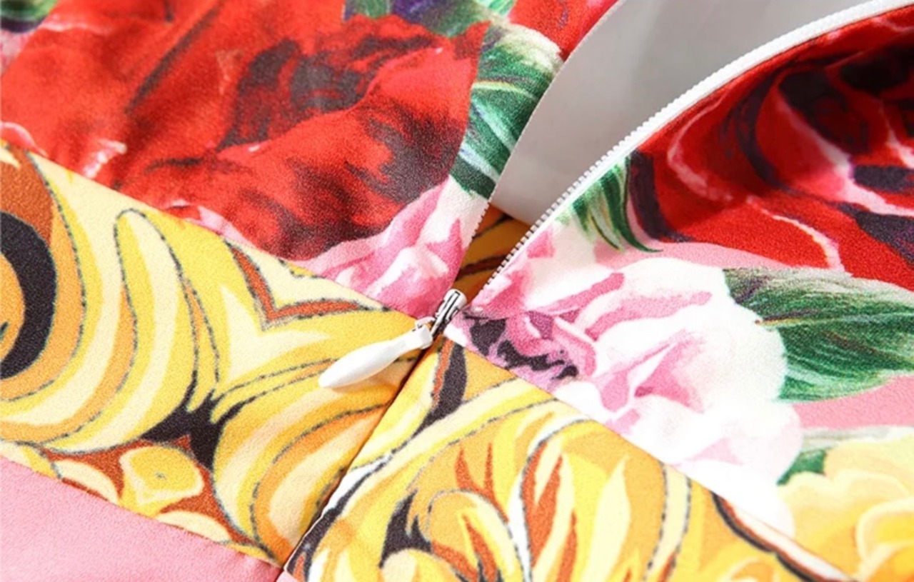 M〜XXL【即納】鮮やかなバラ柄 大人乙女のハイウエストワンピース♡おリボン パール お呼ばれ 花柄 足長効果 ロイヤル セレブ