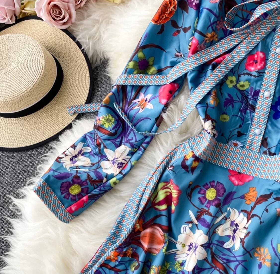 送料無料【即納】♡リボンタイブルーの華やか花柄ワンピース♡大人可愛い 上品 芸能人着用 長袖