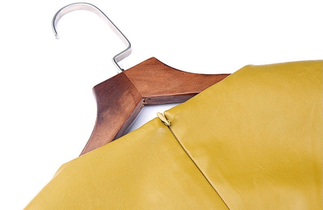 イエローとグリーンの中間の様なお色の上品なレザーのAラインのフレアワンピースになります♡