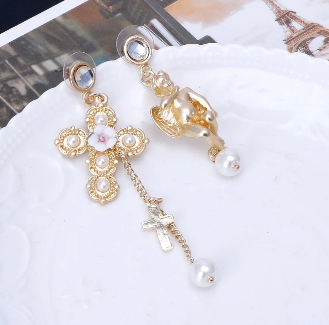 アンティークデザインの天使、クロス、パールなどを組み合わせた欧風の宮殿デザインのピアスになります♡