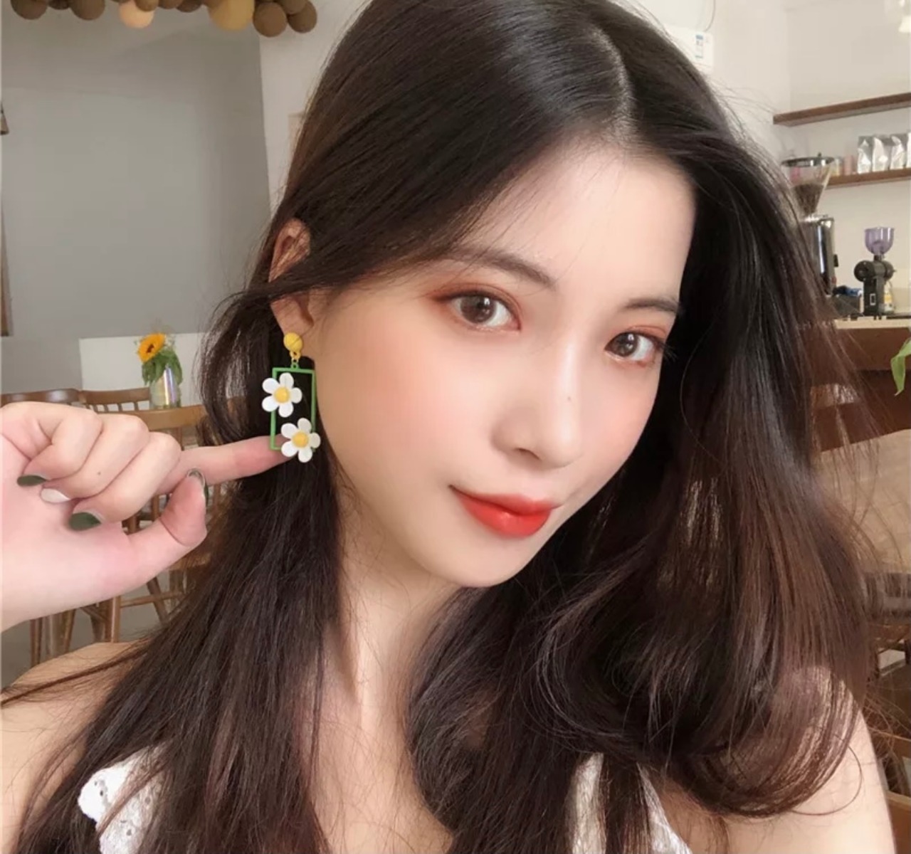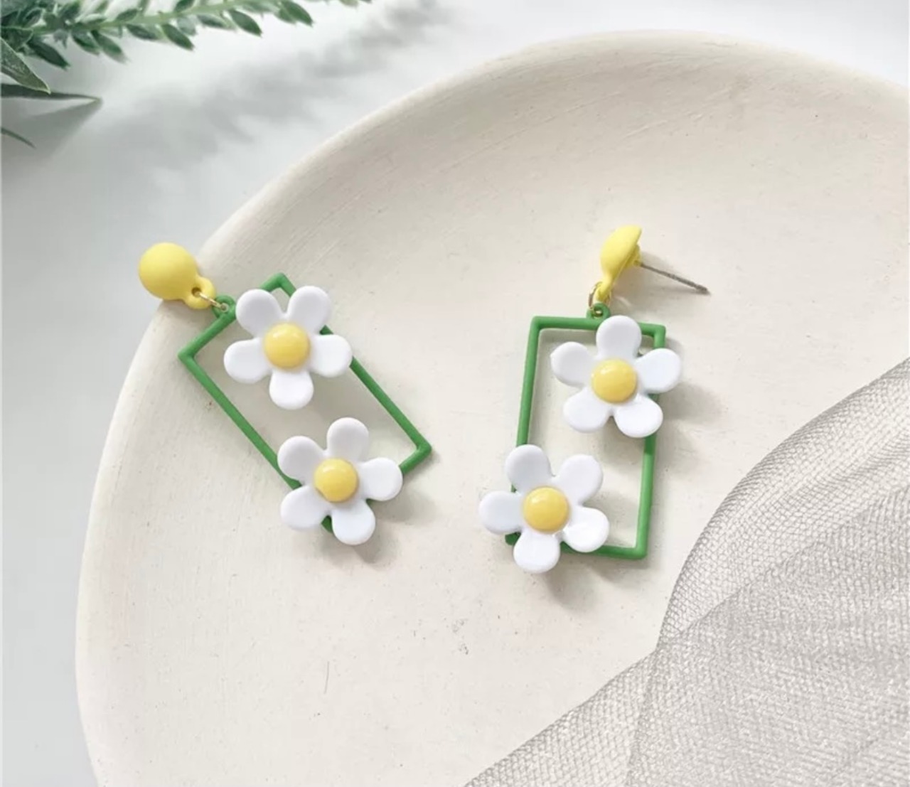 【即納】♡グリーンフレームに白いお花二つのレトロピアス♡昭和レトロ フレンチレトロ 可愛い