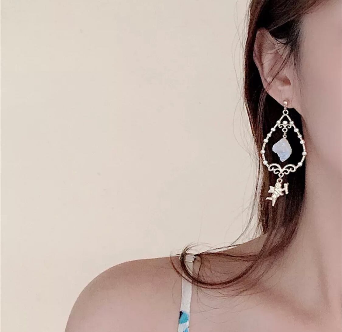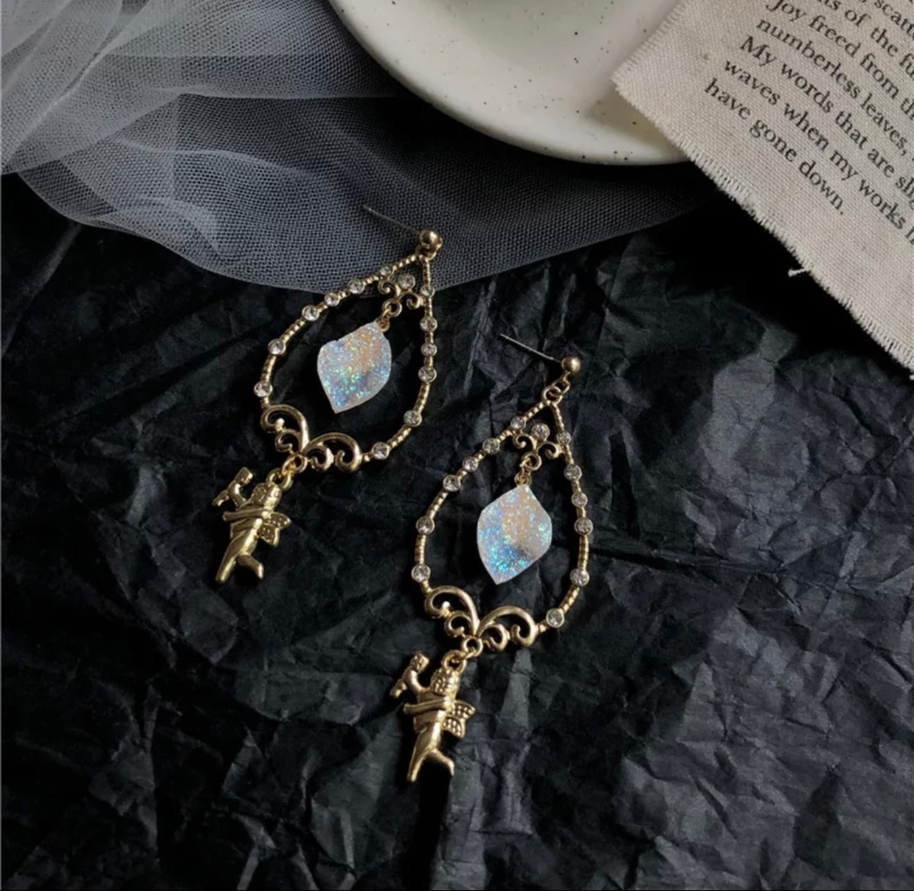 アンティークゴールドにオパール反射のストーンと天使が装飾されたピアスになります♡