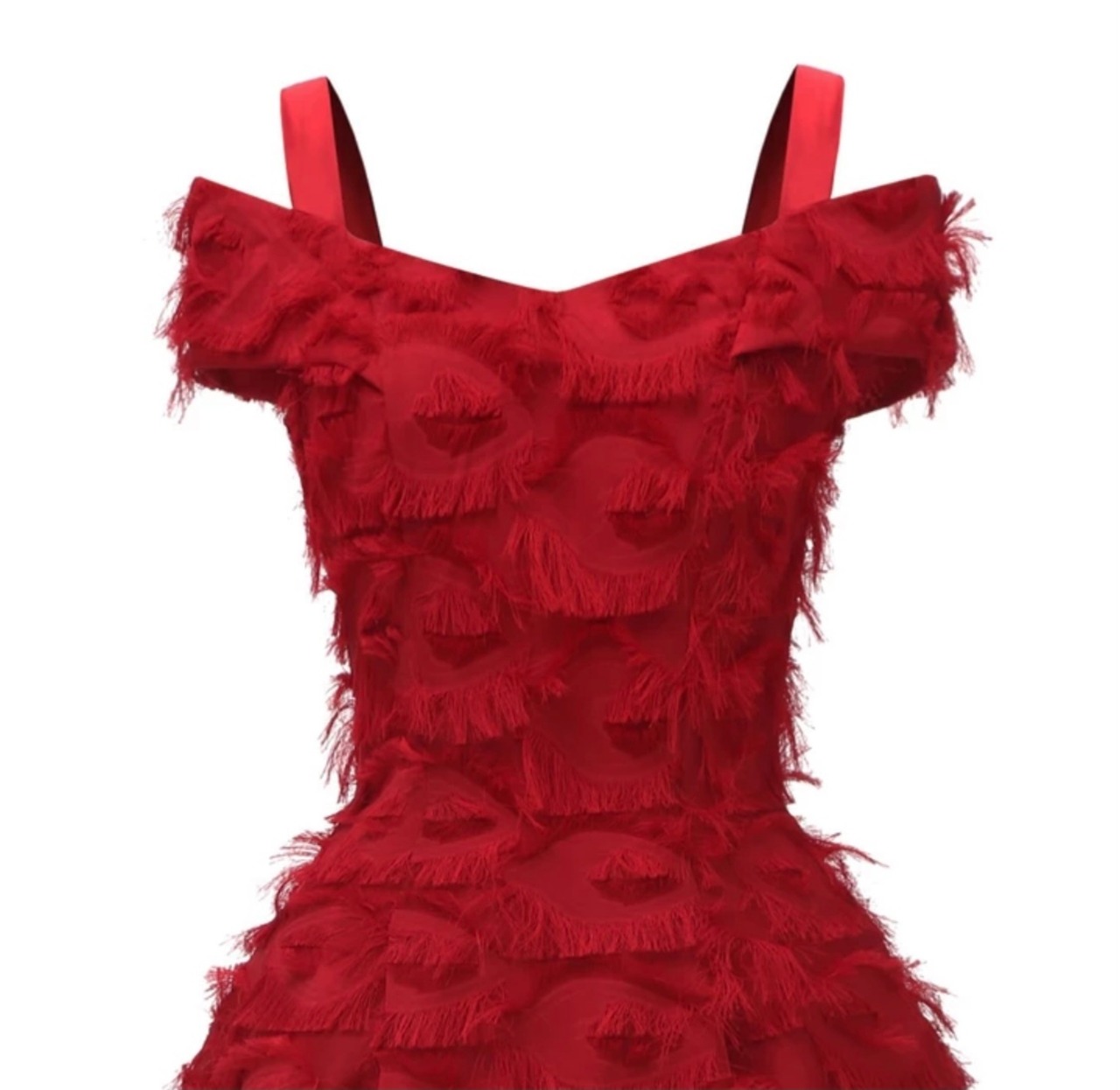 【即納】♡赤のふわふわ羽起毛の50年代映画女優デザインワンピース♡レッド ボックスプリーツ たっぷりフレア