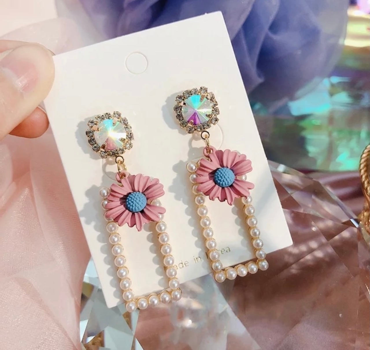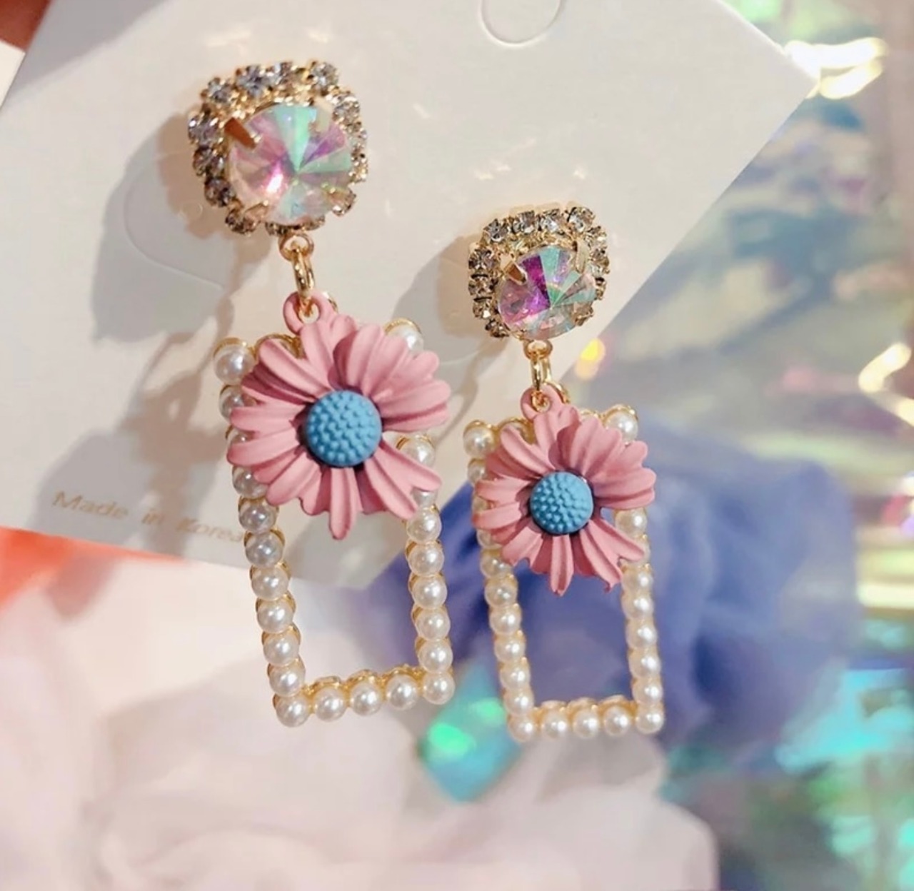 ビジューとラインストーン×パールで縁取られたスクエアドロップにピンクのお花があしらわれた大人可愛いピアスになります♡