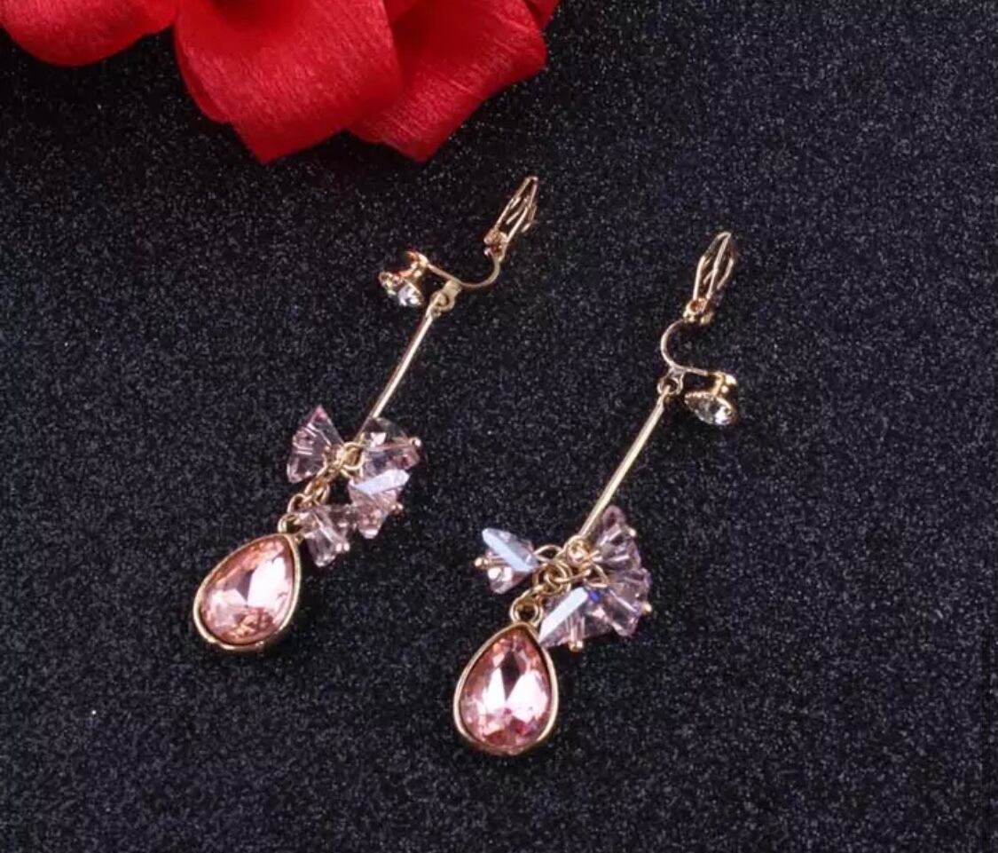 【即納】イヤリング♡ビジューシャラシャラのベビーピンクドロップイヤリング♡イヤークリップ お嬢様 可愛い 甘い お姫様