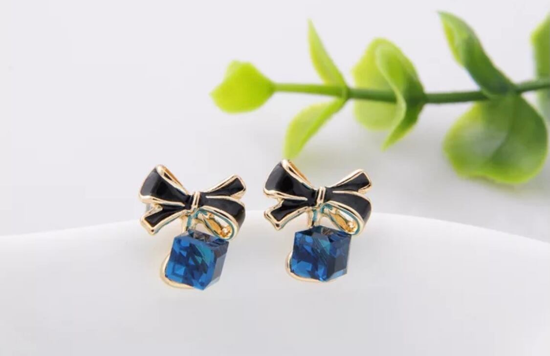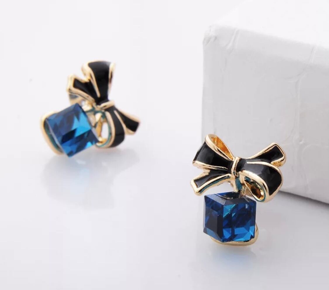 おリボンに透き通ったスクエアのストーンの小ぶりの可愛いイヤリングになります♡