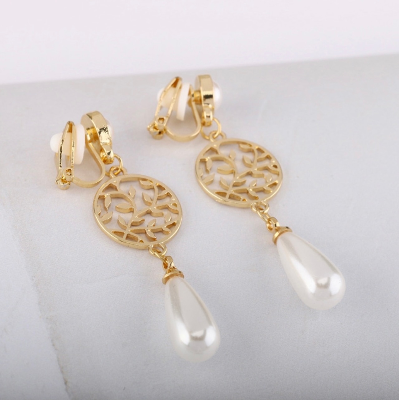 【即納】イヤリング♡イエローゴールド オリーブリーフ透かし装飾&パールドロップイヤリング♡イヤークリップ