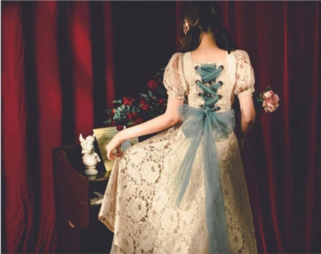 背中にマチが多くあり、背中のおリボンで調整して自分サイズにして着ることが出来るので胸やウエストをキツイのが嫌な時、しっかりと締めたい時などお好みの感触で着用出来ます♪