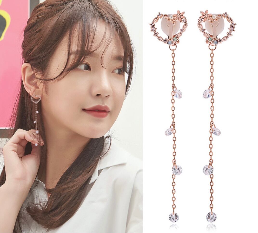 ハートが小さなお花やラインストーンで囲まれており、チェーンがさりげなく揺れる華奢で上品な可愛いピアスになります♡