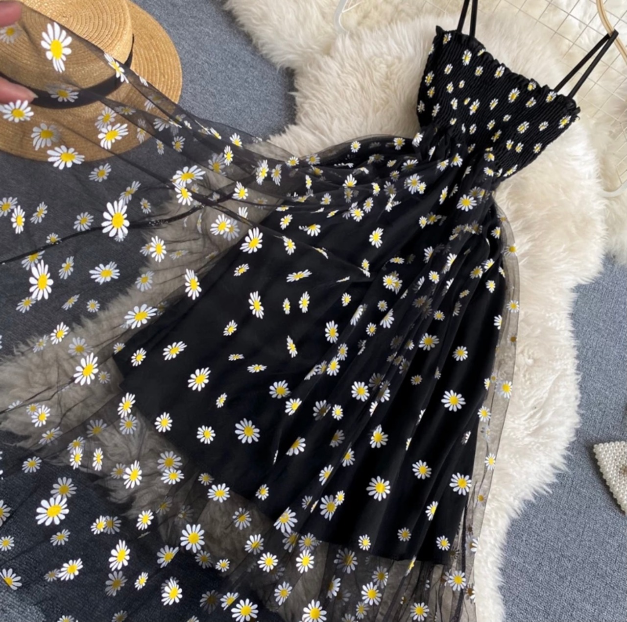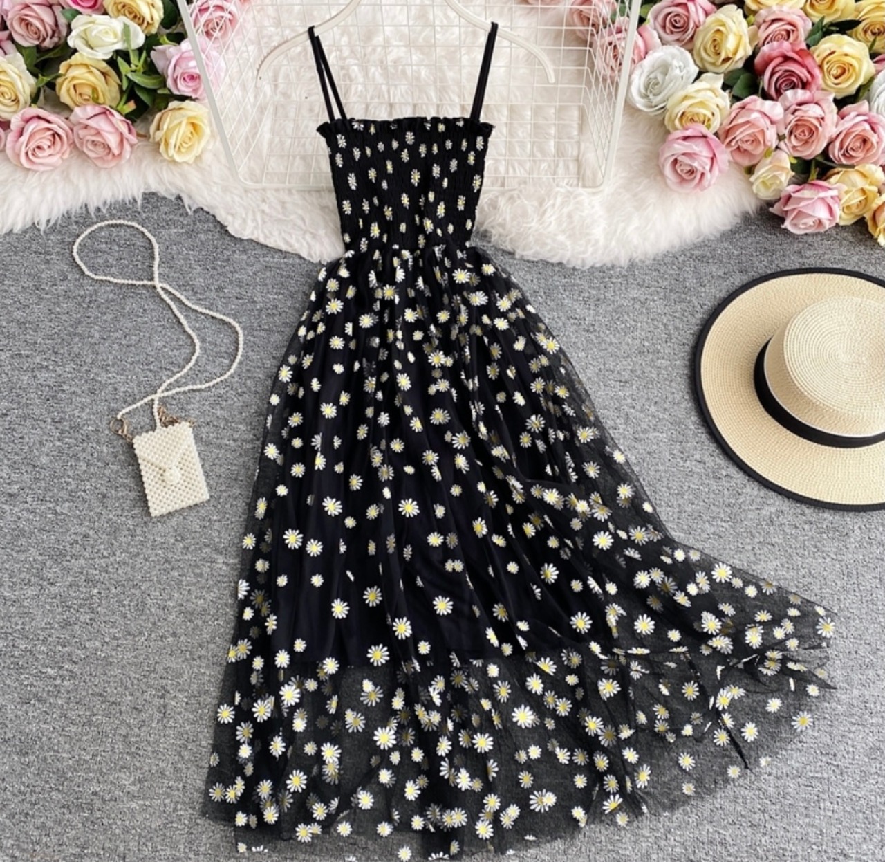 オーガンジーレースに白いお花があしらわれているブラックカラーのキャミソールワンピースになります♡