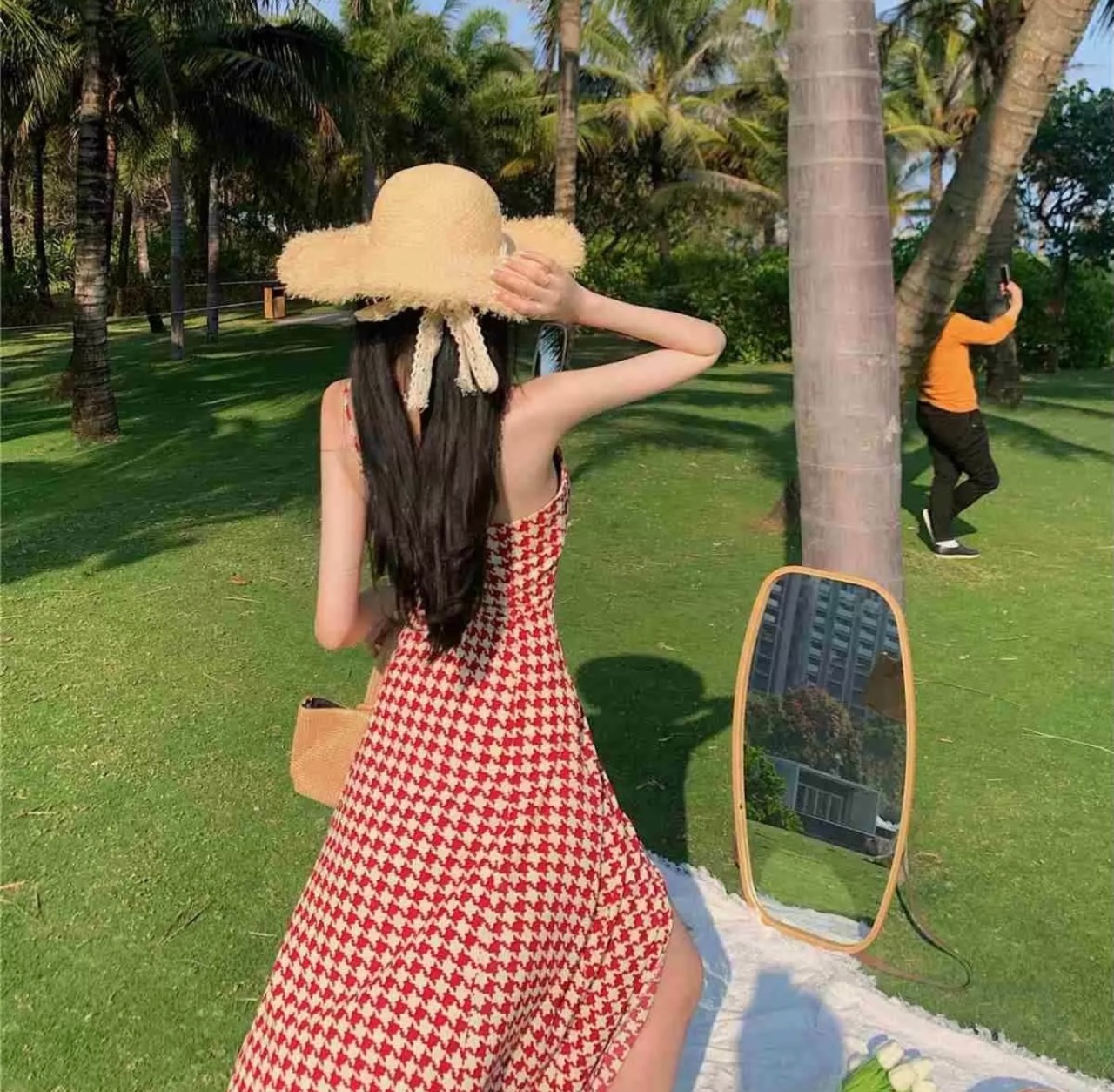 レトロな千鳥格子が可愛いスリット入りのキャミソールワンピースになります♡