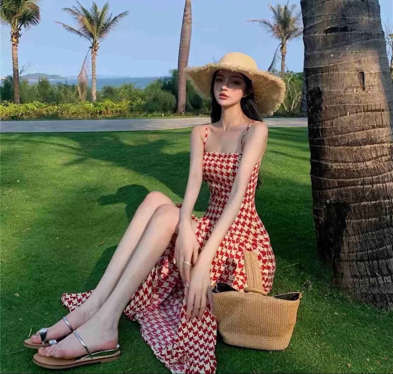 送料無料♡千鳥格子のキャミソールスリット入りフレアワンピース♡大人可愛い レトロ