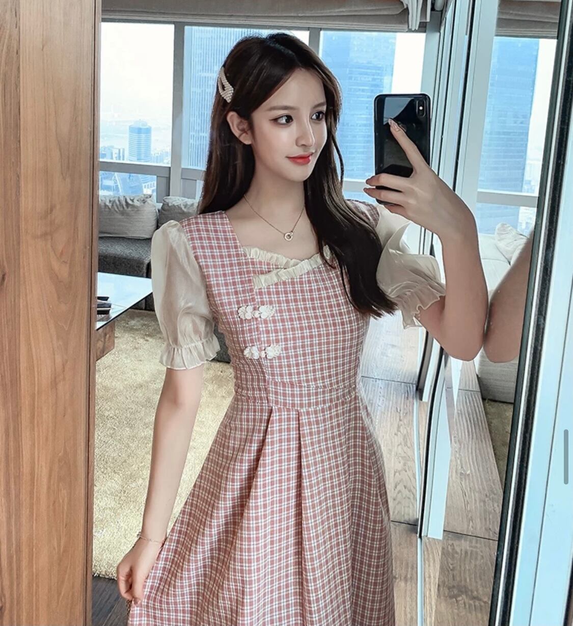 パフスリーブのチャイナデザインのチェックのフレアワンピースになります♡