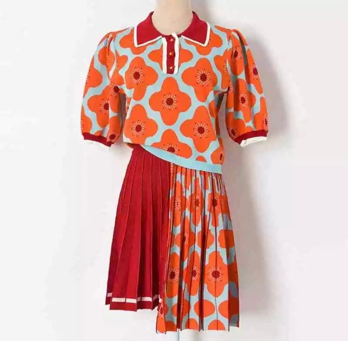 レトロな配色のトップス&動きの出るアシメントリーになったオシャレなニットスカートのセットアップになります♡