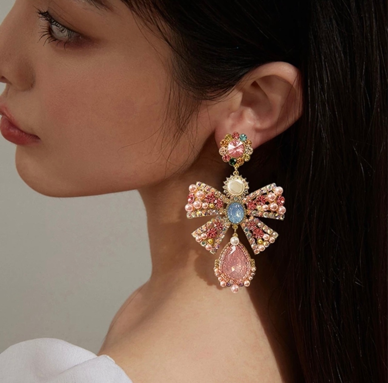 おリボン型のキラキラストーンのドロップピアスになります♡