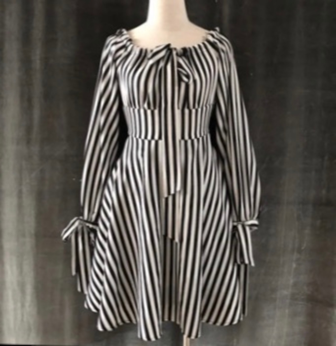 【即納】♡おリボン長袖ワンピース モノトーンストライプ♡ハイウエスト スタイル映え アメリカンレトロ