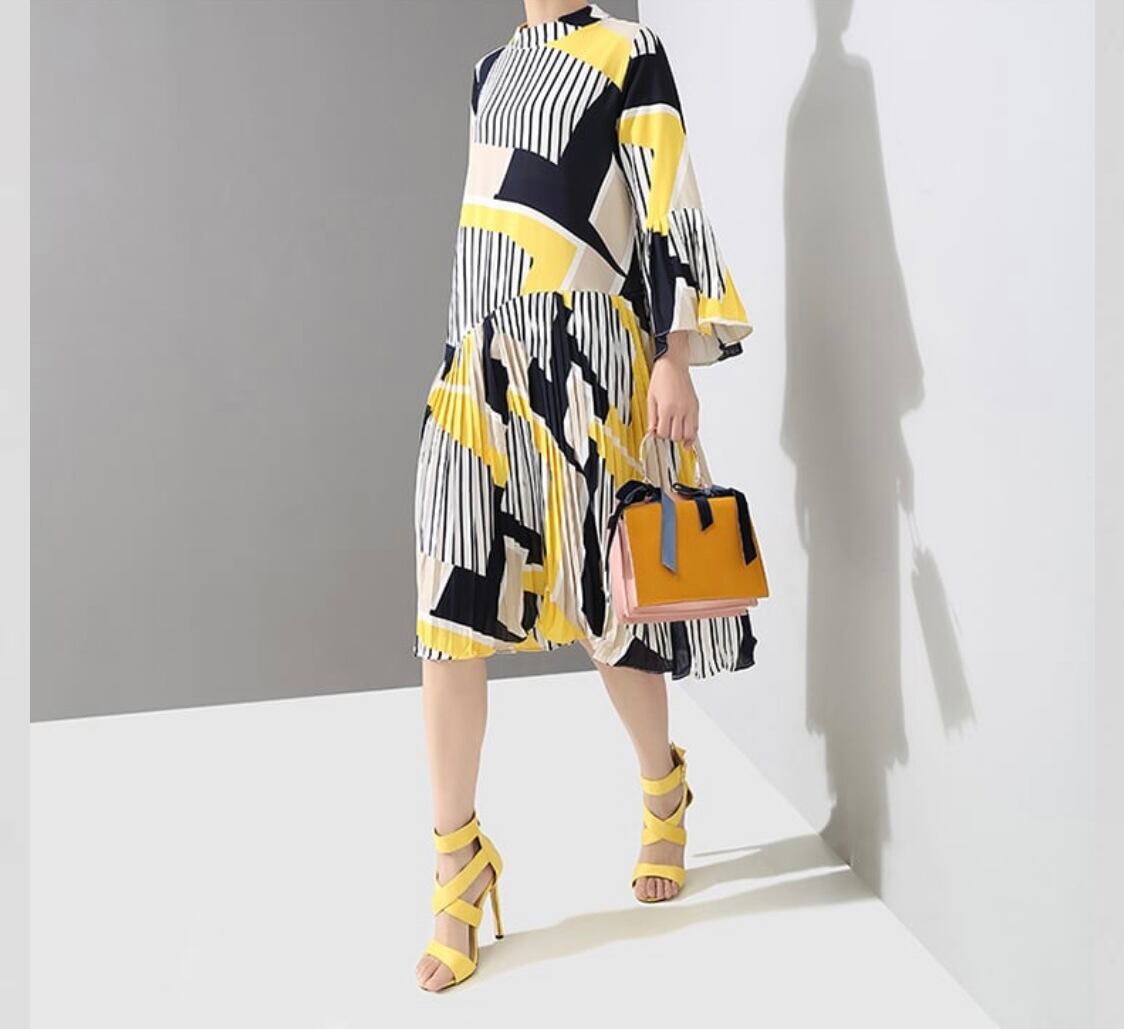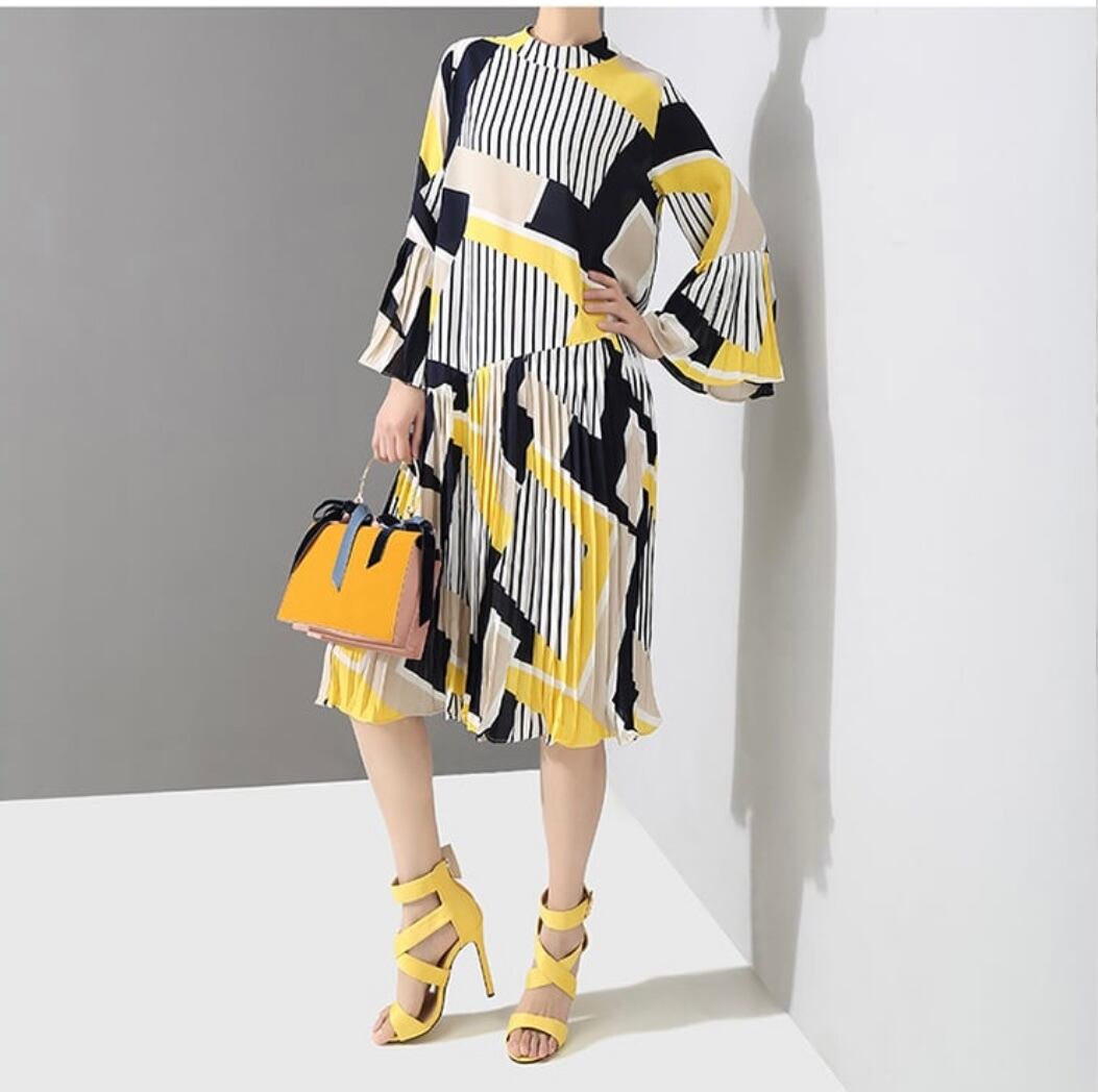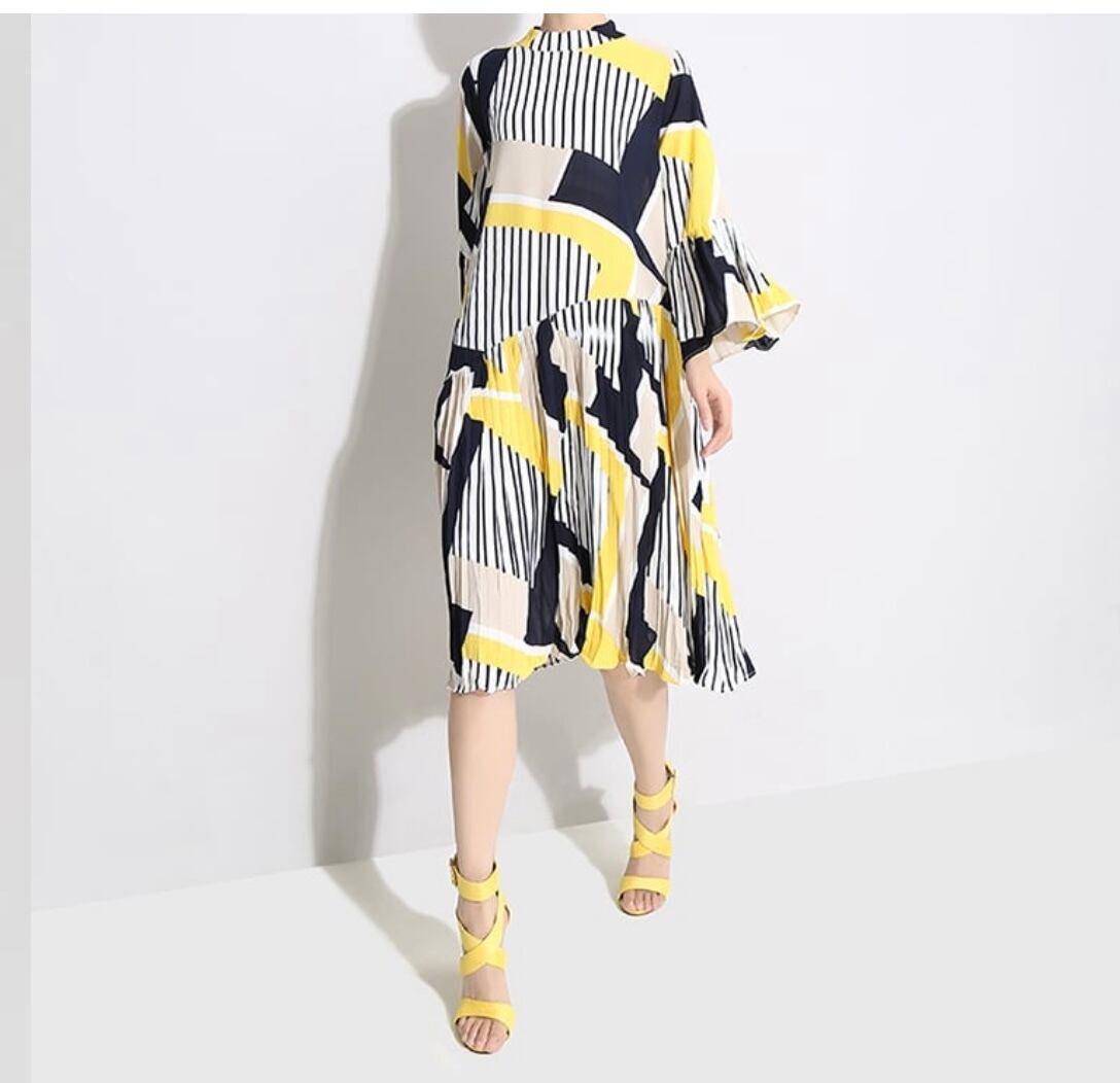 全体のプリントが個性的でプリーツのシルエットが映える大人綺麗なワンピースになります。