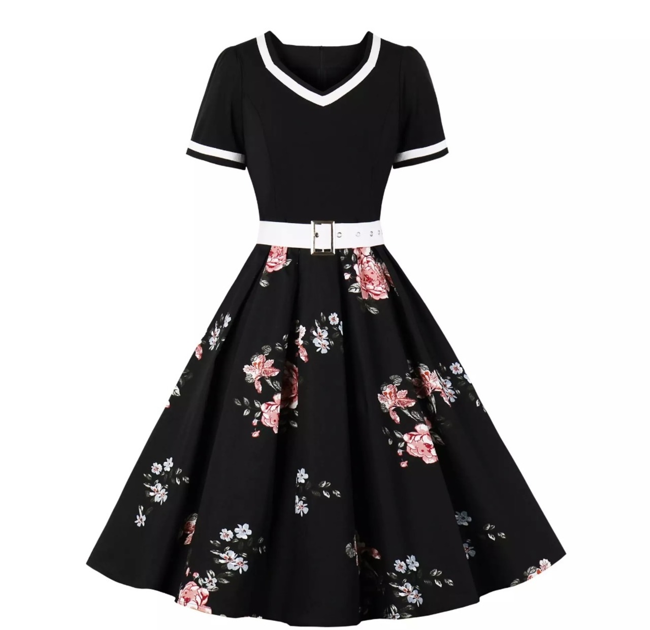 【即納】 50年代ファッション ♡襟白ライン入りのブラック×ふんわり薔薇柄のロカビリーワンピースドレス ベルト付き♡